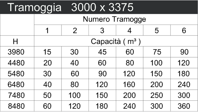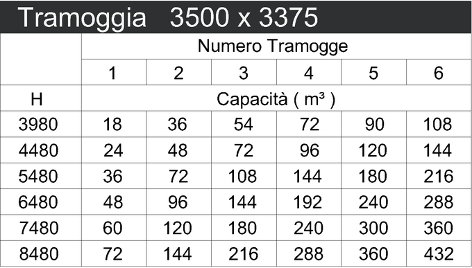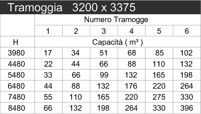Qui di fianco trovate alcuni dettagli tecnici riguardanti le nostre tramogge primarie con relative misure e capacità suddivise per codice prodotto. Cliccate sulle immagini per visualizzare l’ingrandimento.